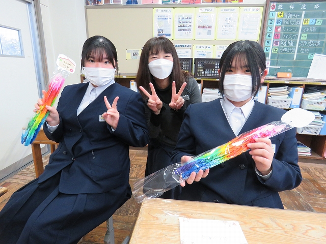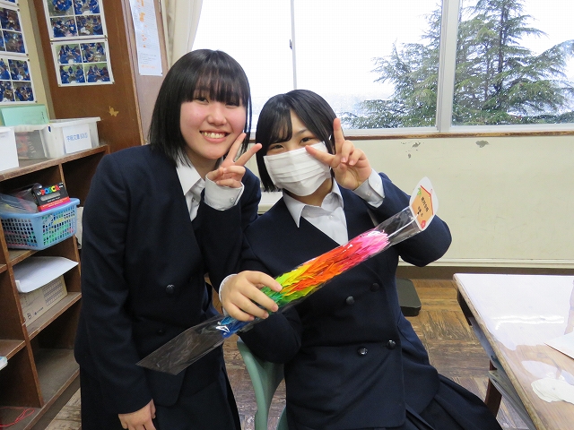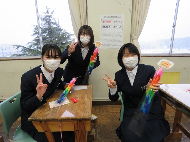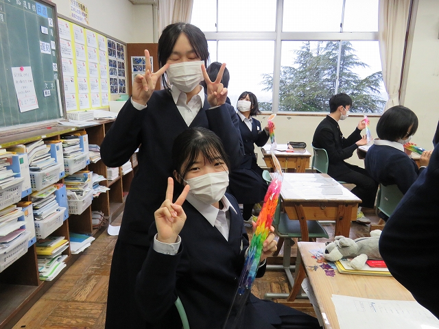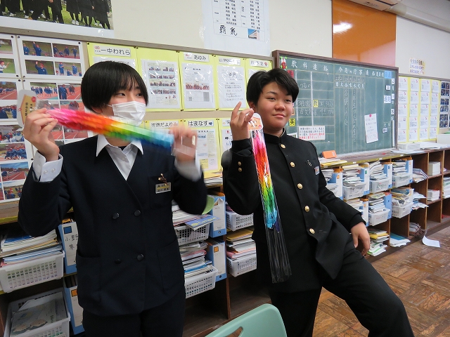 1・2年生から、3年生一人一人に88羽鶴のプレゼント。1羽1羽にメッセージが書かれています。